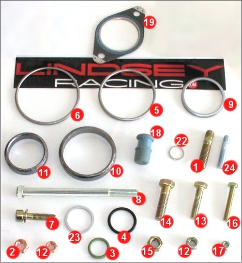 TURBO HARDWARE / SEALS / MISCELLANEOUSSwapping your turbo out, and needing a few gaskets, seals or fasteners? Lindsey Racing makes it easy for you by his illustration showing what goes where.We stock all these bits and pieces so you get things back together properly. If you need help making any decisions, please feel free to telephone or email us.