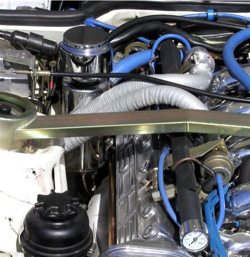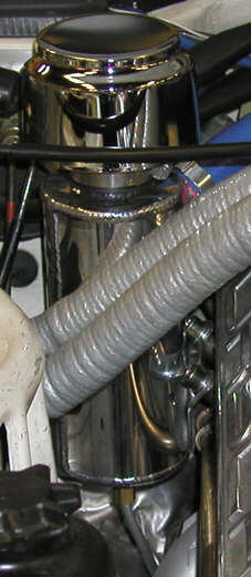 Since the tank is located near the exhaust (which can get hot), we have moved the drain to the bottom of the car so you do not drain oil on to your hot engine. We extend down with an aluminum line to a chrome ball valve attaching to the undercarriage of the car. You can place a container under the drain and collect the oil. You can measure the amount collected and determine the wear and tear on your engine if you like. A car with worn rings will have more blow-by than a car with fresh rings. The custom breather tank is connected to the engine by 3/4" Purosil silicone hose (blue).