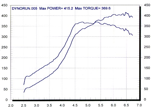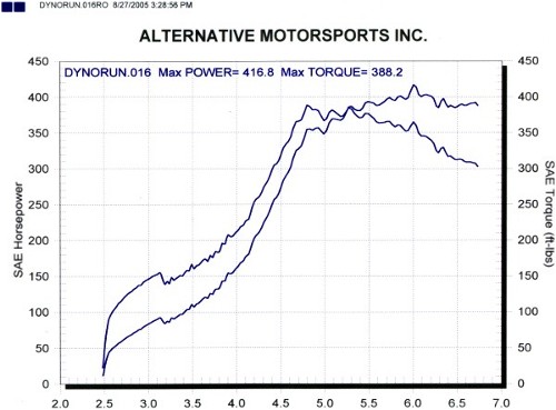 This package makes good initial torque, but the drop off at higher rpm indicated a lack of airflow. This is the limit of this sport turbo. This is our 340 RWHP kit with solid lifters. 416.8 RWHP / 388.2 FtLbs. @ 21 psi. Wes Steward 2.5L 951: