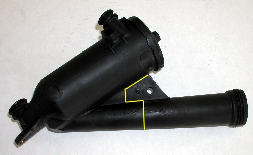 Oil Fill Relocation KitCut and Trim AOS TankWe are going to remove the old filler neck (funnel) from the AOS (Air Oil Separator) tank. The yellow lines represent where you need to make your cuts to remove the material. The cut we are making on the funnel or tapered portion is right between the 944 and 107 part numbers running down the side of the tank. So it's 944 (Cut) 107... ![]() Cut tank.This is what you would have once you remove the material. Sand down or smooth out anything left of the old material on the funnel portion where the hose is going to attach and seal. ![]() Tank in CarHere you see the tank installed on the engine. ![]() Hose PositionHere you see the hose and filler neck in the orientation it will be going. The hose clamps will be used to seal the hose at the bottom to the AOS and the top at the filler cap neck.