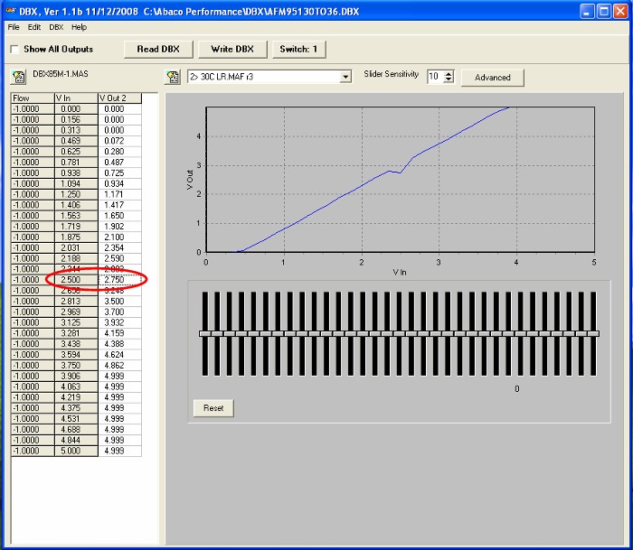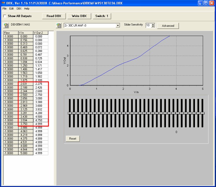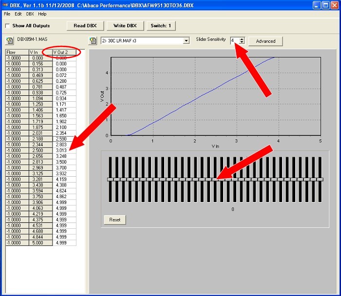QUAD-M MAF SUPPORTSoftware Installation InstructionsFor trouble-free DBX software installation to your PC Click Here Software ProgramThis file is in .zip format and will require un-zipping before use. Full software (8.48MB) available for download Click Here To use this software with your DBX mass air meter, you will need to purchase a USB 2.0 A to mini 5-pin connector. Meter Wiring DiagramThe diagrams are in ".pdf" format. QUAD-M MAF Meter Wiring 944 Turbo (951) .DBX Files ( The quick and simple way to get started )You can load the files with the USB cable without supplying 12 volts to the meter. Other words, you can load the files at the comfort of your desk, then go install the meter in your car. These files consist of a "Project" with one or more .maf files already loaded. (S*) indicates the switch position on the DBX85 MAF Meter head to get that particular calibration. File #1 ----- 19#(S1) | 24#(S2) | 30#(S3) | 36#(S4) ~ MAF CALIBRATIONS 19243036.DBX File #2 ----- 19#(S1) | 24#(S2) | 30#(S3) | 36#(S4) | 951 AFM (S5) ~ 951 AFM / MAF CALIBRATIONS 19243036AFM951.DBX File #3 ---- 951 AFM(S1) | 30#(S2) | 33#(S5) | 36#(S8) ~ 951 AFM / MAF CALIBRATIONS AFM95130TO36.DBX File #4 ----- 944 AFM(S1) | 19#(S2) | 911/993(S3) ~ 944 8v AFM / MAF CALIBRATIONS / 911/993 AFM 944AFM19.DBX File #5 ----- 951 AFM(S5) 951AFM5LR.DBX File #6 ----- 951 AFM(S6) 300RWHP6LR.DBX Consult Lindsey Racing for the particular calibration you should be using for your modifications. Refer to the illustrations below for loading a .dbx file. Select the appropriate MAF calibration you wish to use with the rotary switch on the DBX85 Meter Head. WarrantyThe DBX Meter has a 1 Year (365 Days) warranty from the original date of purchase. If you think you have a meter issue beyond that time frame, contact ABACO Performance, LLC directly to see if they can offer any assistance. PLEASE READ!!! HOW TO & MISC INFORMATION TO KNOWThese tips will help you and keep you moving ahead without additional support. It's important the meter is positioned to flow air though it in the proper direction. The 4 hot wire sensors at the front of the boards should be the inlet side. The white 6 plug connector offset from center is the inlet side of the meter. Once you make any voltage changes or adjustments in the software program to your DBX MAF meter, such as moving the slider bars to richen or lean the mixture, you will need to select the "Write DBX" button to load the changes into the DBX85. You can load the individual table you changed, or if you check the "Show All Outputs" window, then "Write DBX", it will load all 10 tables back to back. Once you load the table(s), you must cycle the meter in order for the changes to take effect. By that we mean you must kill the power to the meter. Turn the key off if the meter is powered by a switched 12v power source, or un-plug the meter. If you still have your USB cable connected to the DBX85, you need to un-plug it as well since the USB is powering the meter. So Kill All Power! So unlike our Mafterburner piggy back fuel controller where you live tune and the changes are immediate, you must "Write DBX" tables and cycle the DBX85 for any changes to take effect. When changing positions on the rotary switch on the DBX85 to switch tables, you must again cycle the meter for the change to take effect. If you change positions on the switch while the car is running, the change will not take effect until you turn off and re-start the car. You can load maps, adjust tables and setting etc... within the MAF by just the use of the USB cable without supplying 12v power to the meter. The USB powers the meter for that purpose but will not supply output 1-5v signal to run the car. Air Temp should be set to "Other Sensors" for 944 / 944T. This is already done in our downloadable.dbx files above. This replicates the factory 3.2K at 60F/25C temp sensor in the Air Flow Meter. The "Ford" setting gives you a 33K at 60F/25C output. Loading a .DBX file to your meterStep #1 "Connect Meter"![]() Once you have the software properly installed (should not be a problem if you followed the instructions), connect your DBX MAF Meter to your computer using the USB 2.0 to 5 pin mini cable. Start the DBX program and your screen should look like above. It should say "connected" in the upper right. If it does not, and you get a connection error message such as [specified device not found], then pull down from the top program menu DBX / OPTIONS then select a different COM port. You will be required to close and re-open the program. Step #2 "Select and Load .DBX File"![]() Once you downloaded a .dbx file to your computer you would like to use, from the top program menu, pull down FILE / OPEN and browse to the .dbx file you downloaded. In this example, we placed it in a directory named Temp2. Select and OPEN that file or double click on it as is you were opening a typical computer file to open. Step #3 "View File"![]() If all is well so far, then your screen should look like above. You can use the drop down and scroll through the different maps and look at the curves if you want. This one is looking at 1>... Step #4 "Upload files to Meter"< ![]() Click in the "Show All Outputs" window. This will then display all 10 maps in a numeric value looking format. By doing this, we can upload all 10 maps to the DBX meter at once. If you had worked just one of the files, you could choose to NOT select the "Show All Outputs" window, then just write 1 of the 10 files to the meter at a time. Step #5 "Transfer .dbx file to DBX Meter"![]() Next step is to depress the "Write DBX [All]" button. After you do this, you will witness the loading of all 10 files and the progress bar as they load displays the amount completed. Once all 10 files are loaded, the screen returns to how it looked before you depressed the button. At this time, you MUST un-plug the meter from the power source, (could mean turn off the key in the car) AND un-plug the USB cable from the DBX Meter