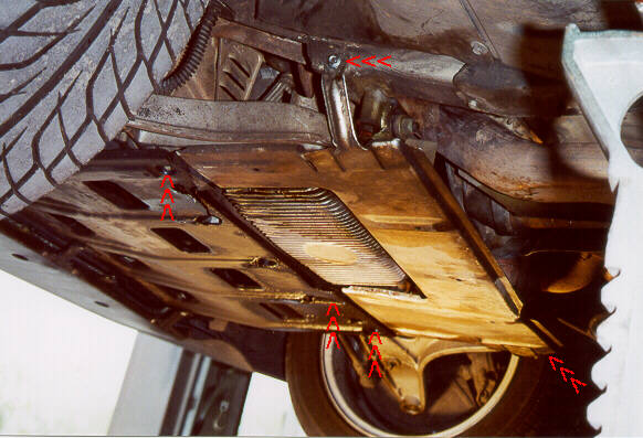 STEP 1![]() Raise the front of the car in the air and support with jack stands. Do not get underneath your car without jack stands or some other approved support. Remove the 5 10mm bolts holding the aluminum shield behind the oil pan. This exposes the wastegate completely.