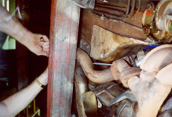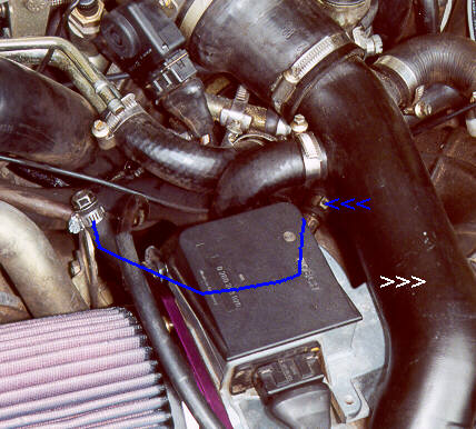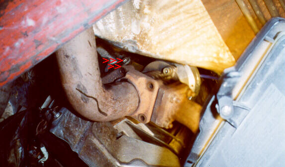 STEP 3![]() Remove the 2 13mm bolts attaching the wastegate mounting bracket to the drive shaft tube mount. These are located way up top about 4 inches above the wastegate and face backward. (RED) We remove the bracket from the wastegate once it is out. The bolts are too difficult to access in the car. What works best for this is a long extension, or couple several together to equal about 18 inches. You will need a swivel socket. The chrome works better than the impact type. A 1/2" will work if you don't have a metric one. Loosen the clamp on the hose at the top of the diaphragm housing. Slip the hose off the fitting. Now it is time to remove the wastegate. You may need to tap on the wastegate lightly on the side port flange to jar it loose from the exhaust outlet pipe. Rotate as necessary and lower down from the car.