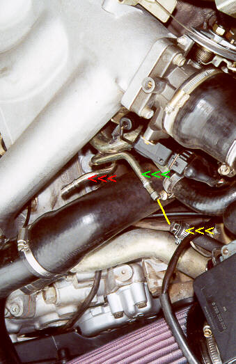 STEP 4![]() This is the old wastegate after removal. There is a doughnut style gasket on the inlet pipe which would be left on the car. There is a metal crush ring gasket on the wastegate outlet pipe. Our experience so far, even after changing the wastegate on this car many times, is that the gaskets are re-usable. For the price of the new ones, you may want to replace them for assurance that there are no exhaust leaks. Remove the 3 6mm allen bolts holding the wastegate to the mounting bracket (RED) and install the same parts and bolts on the new wastegate. Remove the exhaust inlet pipe by removing the 4 13mm nuts with washers. (GREEN) A little WD-40 works well here. If the stud comes out with the nut, remove the nut from the stud because we will be re-using the nuts. The new wastegate has studs already. Here we see the new wastegate with the mounting bracket and inlet pipe installed. We also install the hose barb fittings on the pressure and control port. Use teflon tape on the threads. Note the proper orientation of the inlet pipe to the wastegate. It only works one of the four possible ways you could install it. Raise the wastegate back up into position. Rotate as necessary to get into place. Replace the 4 bolts connecting the wastegate to the outlet pipe first. (RED) Replace the 2 13mm bolts holding the wastegate mounting bracket to the driveshaft tube bracket. (out of sight) Replace the 3 10mm bolts holding the wastegate inlet pipe to the crossover pipe. (GREEN) We assume at this point you have the boost controller installed and are ready to connect the two lines. Connect the boost pressures line (from the banjo bolt) to the top port on the wastegate. (YELLOW) Connect the control line from the regulator to the side port on the wastegate. (BLUE) Installing a dual port wastegate and boost controller eliminates the use for the cyclic valve which is located under the intake manifold at the back. We need to address the old lines attaching it. The metal line coming out from under the front of the intake manifold that used to be attached to the banjo bolt can be left alone and un-plugged. (RED) The line from the cycling valve to the old wastegate can be left alone. The rubber hose that used to connect to the second metal line (YELLOW) coming out from under the intake manifold (GREEN) needs to be plugged. Otherwise we have an intake air leak. You can leave the metal line open. Another option for this hose is to remove it and plug at the intake boot by cutting the clamp and pulling it out. (BLUE) You can slide a bolt or some other similar plug into the hole and install a hose clamp to secure it. You will need to remove the intercooler pipe (WHITE) to access it. This completes the installation of the wastegate. |