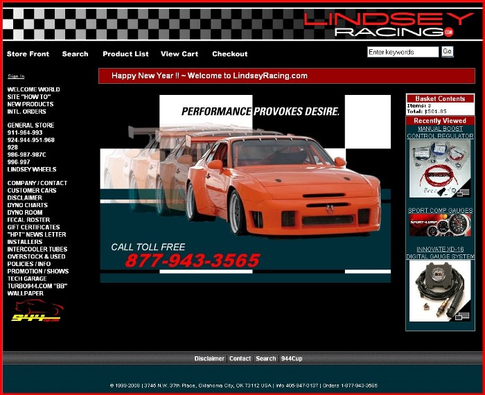Happy New Year and we hope it's already off to a great start. Maybe you have a few New Year's resolutions that hopefully won't go in one year and out the other! But seriously... Lindsey Racing wishes each of our readers, customers, vendors, friends and family a successful year in what ever you do, and have plenty of time to spend with those close to you. We hope that includes your Porsche and that you will continue to let us keep it healthy and always exciting to drive in 2009! Our Christmas stocking stuffers specials were more popular then ever and we hope that made Christmas a little more joyous for those finding new P-car bits in your stockings over the fireplace. Our 944Cup National Sponsorship commitment for 2009 includes participation in all 7 regions as well as