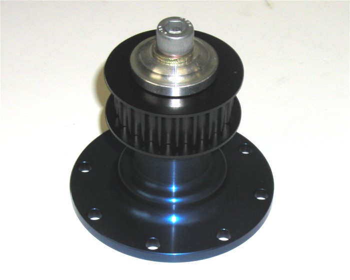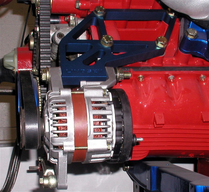 The above picture is of the crankshaft drive mandril with drive gear for the oil pump. Plenty of oil pans are in stock. If you're wanting to go DRY SUMP, you could start assembling your system now. Toss on the small bits and pieces as they are available. Our new version of our A/C Delete Bracket accepts both the factory alternator or the small 7# Bosch Racing Alternator we now carry. This is the same alternator we built into our new dry sump oiling system. We felt it made sense to offer it to those not running a dry sump but those who just want to cut another 7 or 8 pounds from their cars. After all, who needs 110 amps anyway? The bracket looks much like our previous bracket at first glance. Although we have never had a reported failure, we widened the webbing slightly to strengthen the part. The receiver tongue at the base of the bracket is narrower than it's predecessor. That was a requirement because the Racing Alternator has a narrower spacing on the pair of mounting ears.