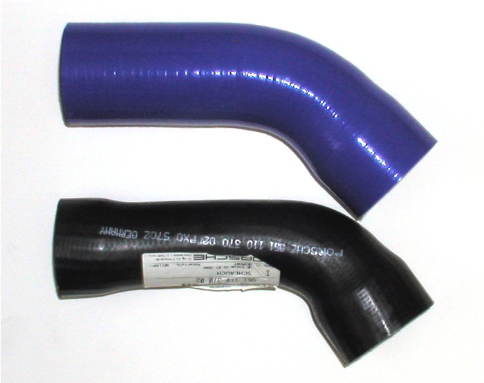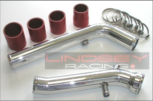 Because of the narrower tongue, when using the stock alternator you will need to use the spacers provided with the new bracket. The main identifying feature to tell the two apart is the previous bracket has "LINDSEY RACING" machined into the face, and the new bracket has just the word "LINDSEY". If you want to use this new Alternator and you have one of our previous brackets, we can instruct you on where to machine down the tongue to accept it. In order to use our A/C Delete Bracket on your 944, 951 or 968, there will be a few steps that need to be performed. First you will be required to drill the two holes out on the two mounting ears on the alternator from 8mm to 10mm. We have found that it's very easy to drill the ear that is all aluminum. The other ear has a steel spacer in it. It's much easier to tap the spacer out and hold it with some vice grips when drilling so it doesn't rotate. If left in the alternator, it will rotate. Next is the alternator pulley. The alternator comes equipped with a V belt pulley which needs to be switched. It's required that you remove the pulley from your old alternator for use on this new one. But it's not that simple. You will be required to have the center recessed area machined to thin it down to allow the shaft nut to have full thread engagement. A small lathe would be the key for that job. All the hardware required to make the switch comes included with the Racing Alternator Kit. We now have a Silicone Hose Kit for the stock hard pipes on your 944 Turbo. The missing link was a hose connecting the turbocharger to the hard pipe leading to the intercooler. The factory hose (black hose in picture) has a 45 degree bend in it and reduces down from 2.25" on the hard pipe to 2" at the turbo. That's what this hose also does. Only this new hose (blue hose in picture) doesn't get smaller right out of the turbo like the factory hose. Plus the radius of the bend is larger and smoother. Those combined equals increased flow with less pressure drop. Our kit includes this hose as well as the intercooler connections and the hose connecting the 2nd hard pipe to the throttle body.