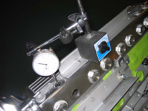 NOTE: It's much easier to perform the next step if you have a Lindsey Racing prepared cam box with inspection ports machined down the side. These ports are there to allow you to access and measure the lash on the valves. They also make it much easier to locate the dial indicator foot on the #1 intake lifter. It's very difficult to look down the top bolt access hole and position the foot on the lifter with the dial indicator in the way. We recommend if your cam box is off the car, and you're equipped to do so, drill and tap a hole in the cam box for a pipe thread plug. You can contact us for the exact location if you like, but it's in line