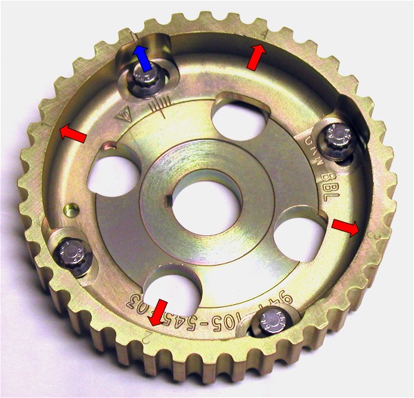 Put a mark 5 teeth left or counter clockwise from the alignment mark (blue arrow) on the cam gear. Then count 10 more teeth and put another mark. Then 10 more, and 10 more. You end up with 4 marks 90 degrees apart from one another.